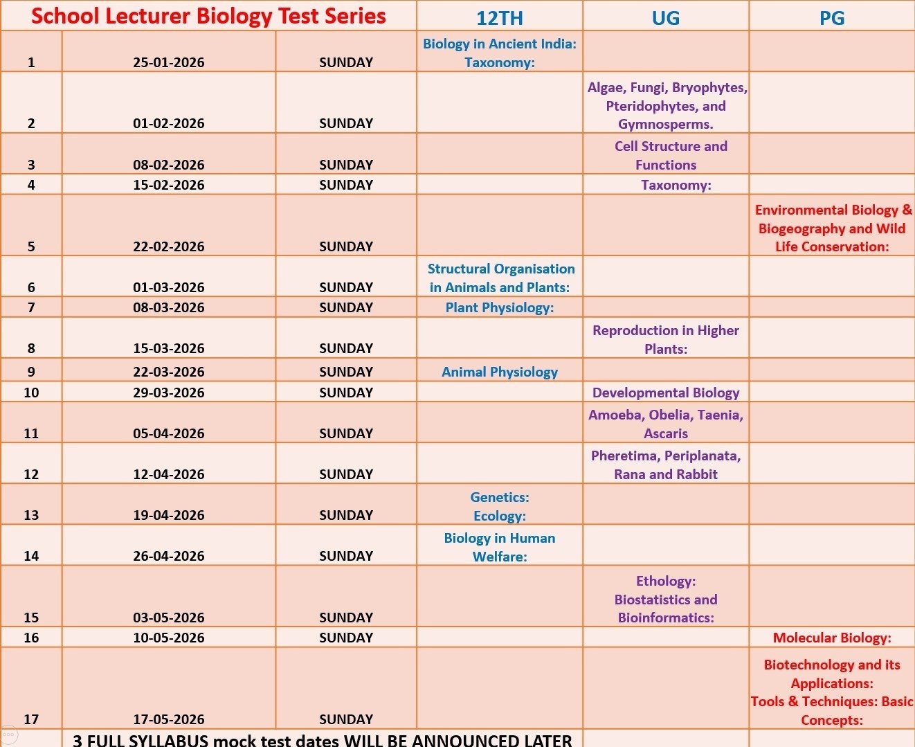 The School Lecturer Biology Test Series 2026 is a carefully planned and academically balanced test program designed for aspirants preparing for the RPSC School Lecturer Biology Examination. As shown in the provided schedule image, this test series follows a systematic, Sunday-based testing pattern starting from 25 January 2026 and continuing till 17 May 2026, ensuring complete syllabus coverage from 12th, UG, and PG levels.